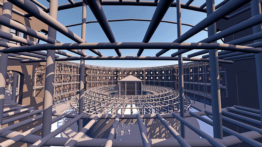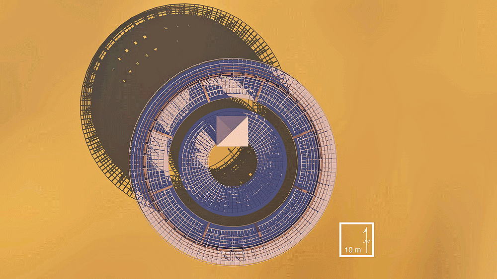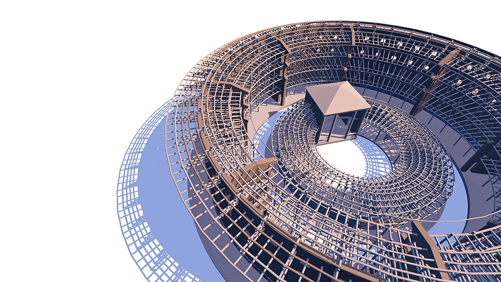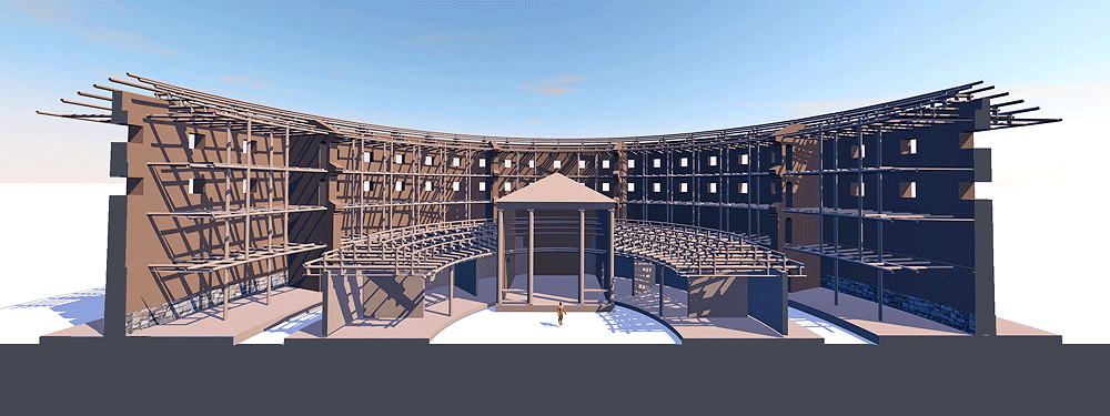 Materials: unfired mud brick outer wall and interior fin walls; wood construction for roof, and interior beams, columns, and purlins.